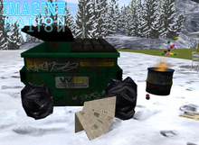 Imagine dumpster wBlowing Trash & fire Barrel