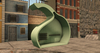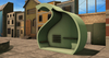 Delicate design with sweet lines with a shape that recalls an apple. Stucco roof and weathered wood shelves.