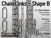 An useful Full Perm Pack of Chain Link lengths, great for hanging things like lampshades & lights, meat hooks, suspension 'therapy' and many more uses. This Shape B comes in two profiles - smooth and ridged, and two color variations (Silver, Rusty).And our usual bunch of Textures are included ie 4 x PBR, 4 x Diffuse, 4 x Normal, 2 x UVW guides, and 2 x Ambient Occlusion maps.