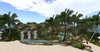 Lush tropical plants, flowers and palm trees