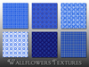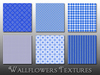 This pack contains 12 seamless textures in shades of bright blue and white, including stripes, plaids, florals, polka dots, and damasks.