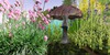 Beautiful Flowers all colours, rocks, 2 Alpine trees, and mushrooms with a wooden path through the center. Stone walk through arch way. All is made from mesh except for the mushrooms.