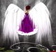 An angelic, yet daringly low cut corseted gown with a semi-sheer front panel. Black ruffled trimming ads a bit of modesty, with matching bows and lacing.