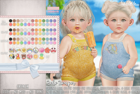 All clothing is for Toddleedoo and/or Bebe Body unless stated otherwise in the product description, and no refunds offered outside of accidental double purchases; Please note, however, that due to the TD creator's body updates, older items will fit loosely on TD body versions 4.0 & above and has no way of being fixed on Tiptoes behalf. Furni marked w/Upsies logo includes Autoplay for bot babies!