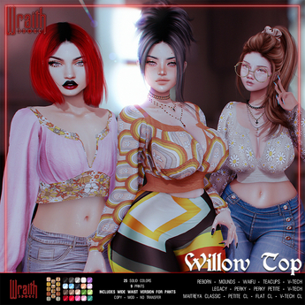 Wraith specializes in offering inclusive rigging for men, women and everyone in-between! I try to offer as many inclusive chest options as possible as well as bulge options on bottoms! Some of my older items will not be as inclusive due to a later development of my skills in meshing!